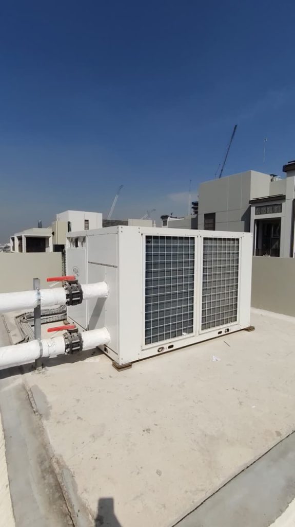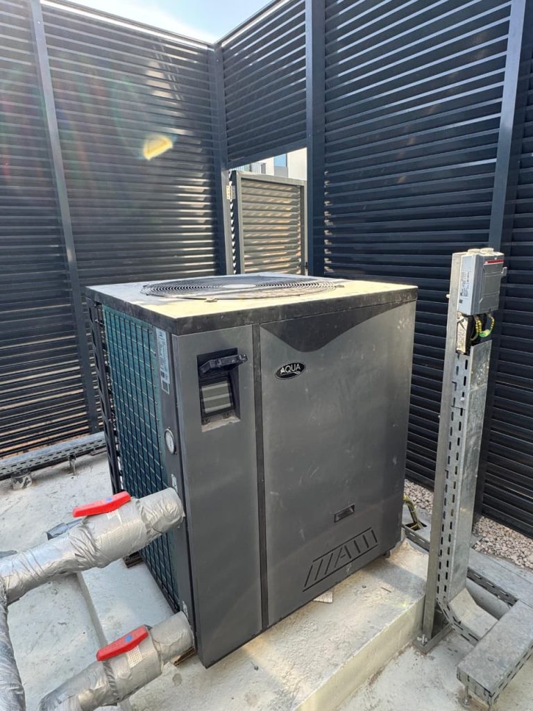 A luxury villa pool project at Jumeirah Bay, Dubai, where AQUA supplied VFD pump, filter, auto backwash controller, and HC unit, ensuring efficient water circulation, automated filtration, and optimal pool temperature control.