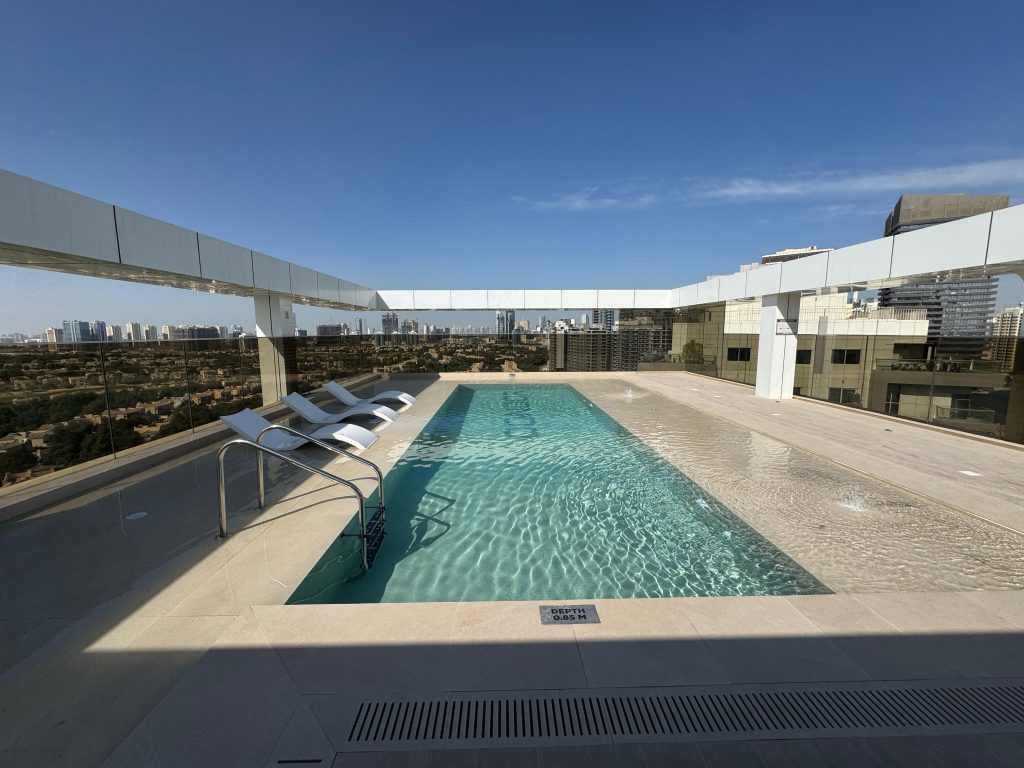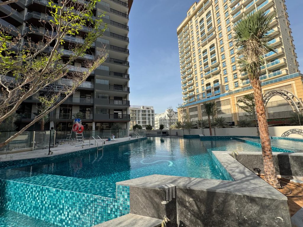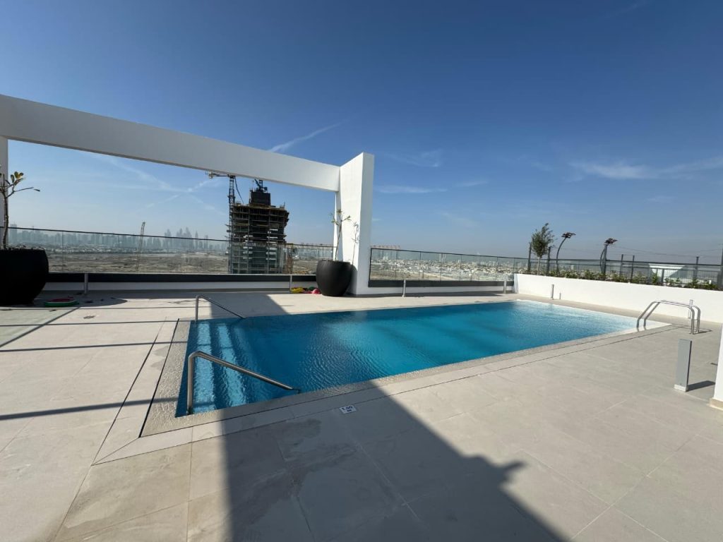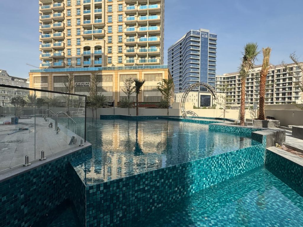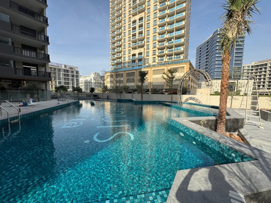 Binghatti Aurora, JVC features a modern swimming pool equipped with our premium pumps, filters, dosing systems, heat‑cool pump, lights, transformers, and pool equipment, delivering both performance and reliability.