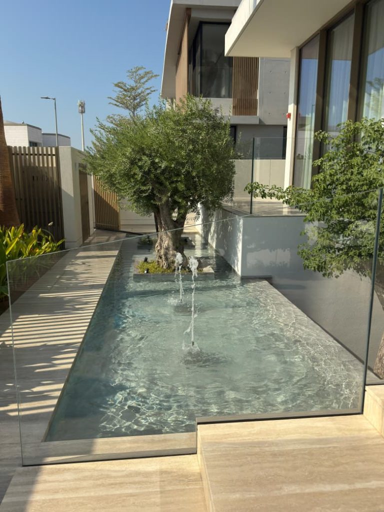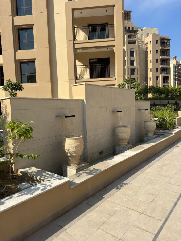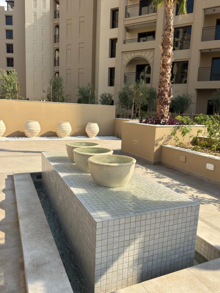 A premium water feature project at Palace Residences, Dubai Creek Harbour, where AQUA supplied filters, pumps, transformers, and lights, ensuring efficient water circulation and an elegant illuminated display.